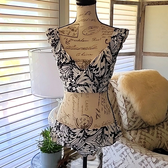 Bra sized cups, no paddling, lined, black on white background. Low. hipster bottoms withe ruffles complete this cute and feminine swim set.