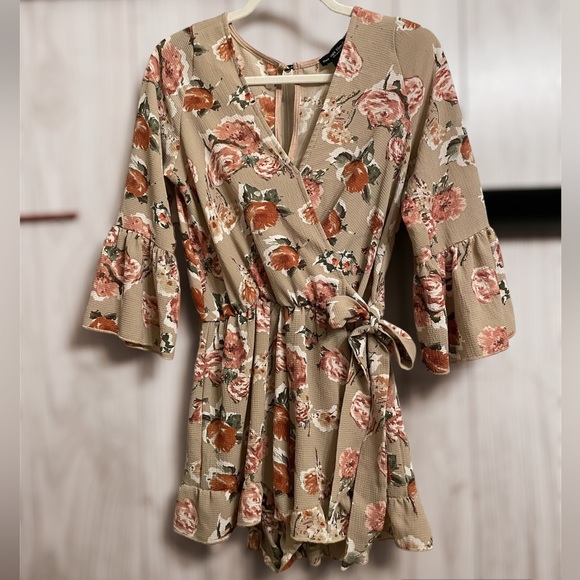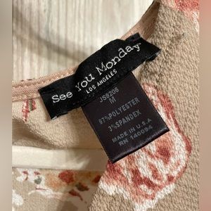 Short floral and neutral romper with pink peach and white roses. Beautiful and like new. Button close at neckline and elastic waist with bow tie. Size M but is short in the torso, wont work for tall ladies. Brand See You Monday, Los Angeles. Message with an offer!