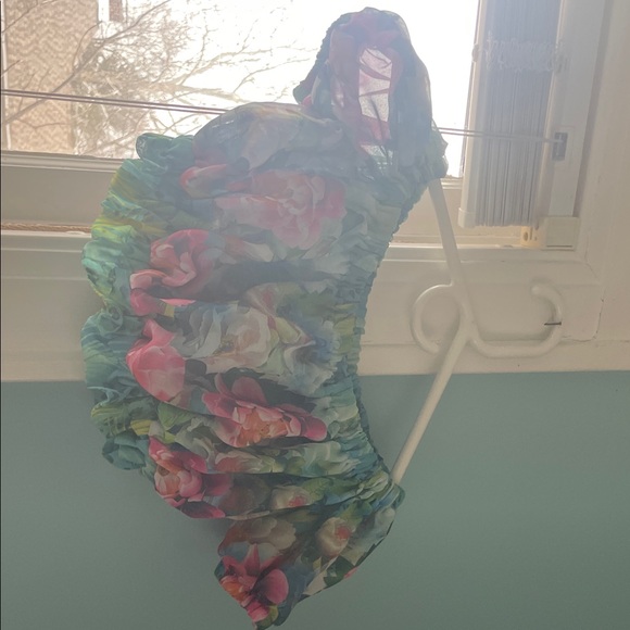 Vibrant floral top with ruffles. Features a mix of pink, green, and blue hues. Brand is luomeidisha fashion