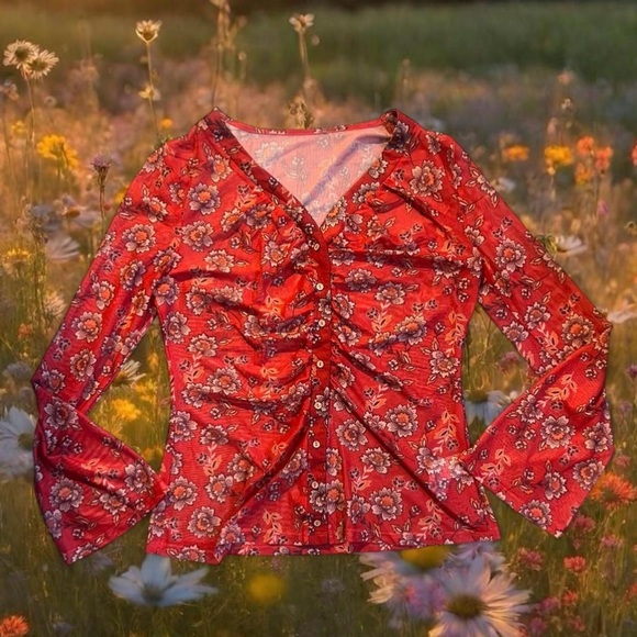 Chic red blouse with floral design. Features long sleeves and ruched front. Ideal for stylish outings. #floral #cottagecore #buttondown