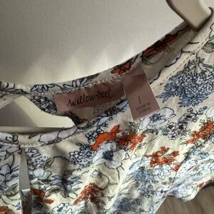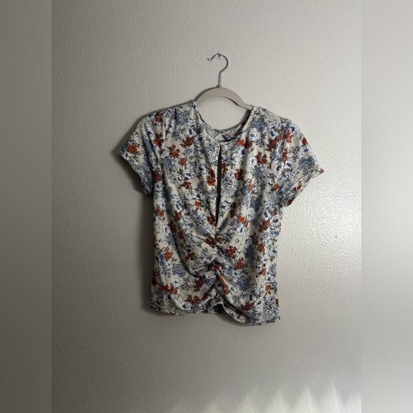 Chic blouse with a rutched front design and open back. Features vibrant floral patterns. Perfect for versatile styling! ❤️💙