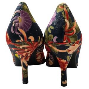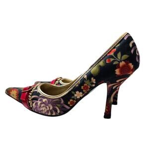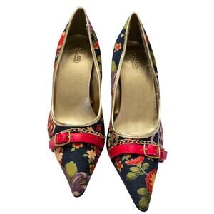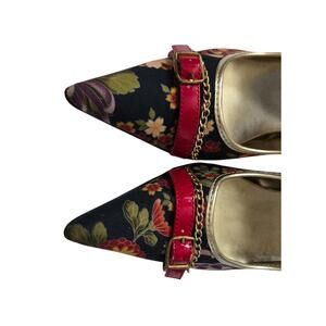 Floral Satin Heels Size ~6.5–7 Multicolor Pointed Toe Pumps Red Buckle Accent