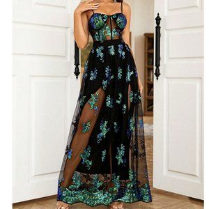 Floral Sequin Mesh Overlay Cami Party Dress