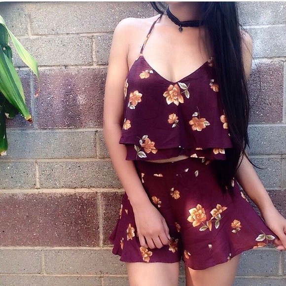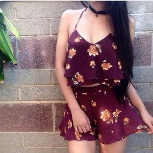 Burgundy floral set. Both top and bottom are size “small”. You can wear them together or separately with a cute high waisted girlfriend jeans or a white crop top
