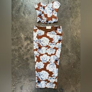 Stylish corset & skirt set with a beautiful floral design in brown and blue. Perfect for adding a touch of elegance to any outfit.