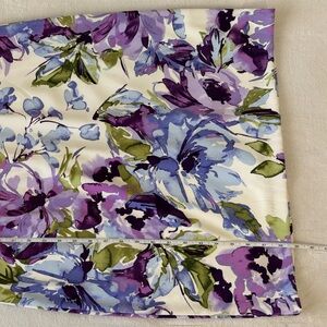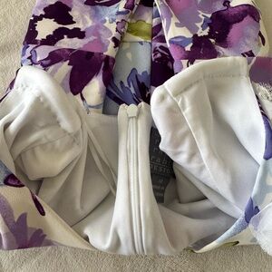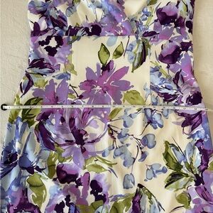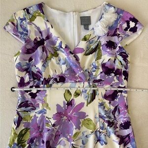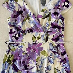 Floral dress in purple, blue, and green design with a flattering fit. Nice structure with V-neck and cap sleeves.