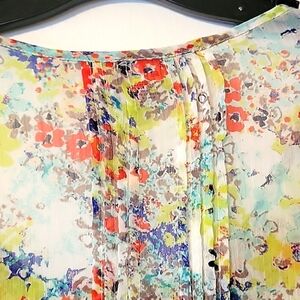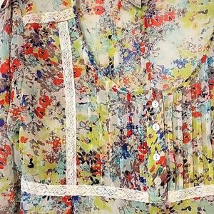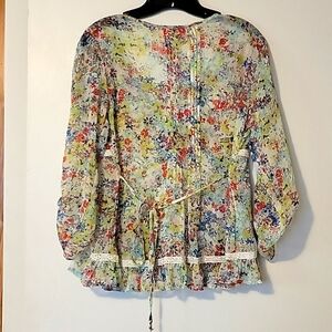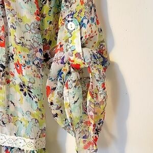 Floral Sheer Baby Doll Top with buttons down part of front, lace on front also. Tie in back. Sleeves can roll up & button. Very cute! No rips, tears or stains. Smoke and Pet free home.