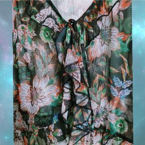 Elevate your style with this chic floral sheer blouse. Featuring a vibrant mix of black, green, and orange, this top is perfect for any occasion. Its lightweight fabric and elegant design make it a must-have addition to your wardrobe.