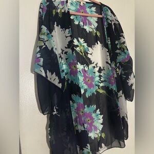 Sheer kimono with vibrant floral print. Features purple, teal, and white flowers on a black background.