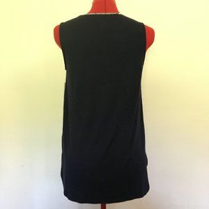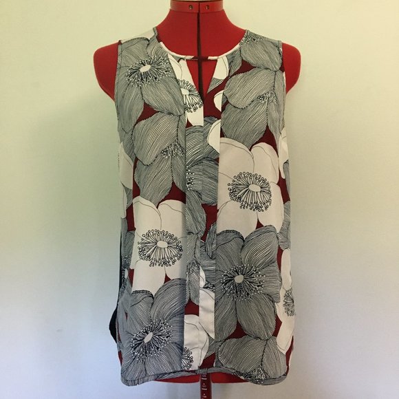 Size S, Merona brand, pretty floral pattern on front (100% Polyester) and navy knit material (95% Rayon, 5% Spandex) in back.