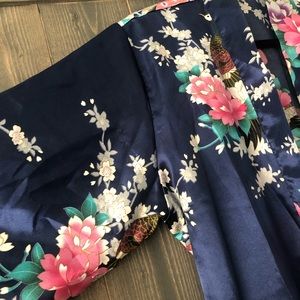 Blue floral silk robe with tie. Worn once for a few hours. No signs of damage or wear