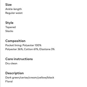 Ankle length slacks in woven stretch fabric. Regular waist, concealed elasticized waistband, and zip fly with concealed hook and eye fastener. Side pockets mock welt back pockets and tapered legs.