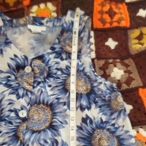 vintage Chic sleeveless blouse style dress with a vibrant blue floral pattern. Features a button-up front. semi sheer material. 100% rayon.