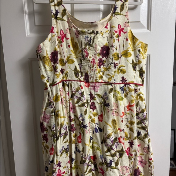 Charming sleeveless cocktail dress in excellent condition with a vibrant floral pattern. Unfortunately I do not know the brand as I guess the tag was bugging me but it is really nice quality. Features a mix of pink, purple, and green flowers on a cream background. Square neckline and cotton lining so keeps you cool in the summer heat!