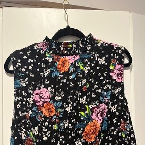 This elegant sleeveless dress features a vibrant floral pattern on a black background. Perfect for any occasion, it combines style and comfort effortlessly.