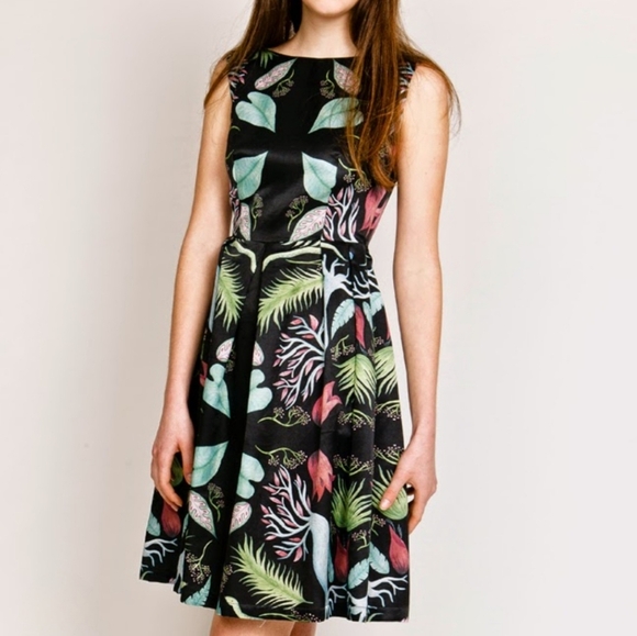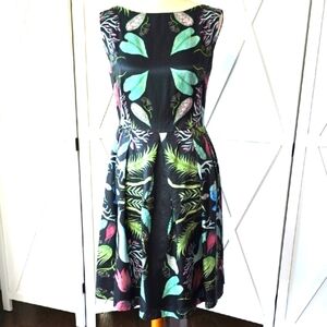 This rare and unique sleeveless dress features a vibrant, colorful pattern. It has a front boatline shape, with a V-shape back. The left-side has an invisible zipper closure. A fully lined, A-shape flowy skirt adds a touch of sophistication to your wardrobe.