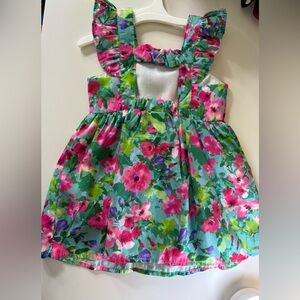 Vibrant floral sleeveless dress with ruffle details. Perfect for summer outings.