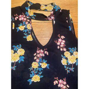 This sleeveless top features a beautiful floral pattern, a flattering keyhole design, and a chic collar.