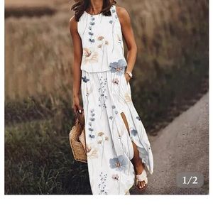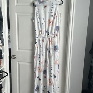 Embrace elegance with this sleeveless maxi dress featuring a beautiful floral design. The white base is complemented by blue and pink accents, perfect for any occasion.