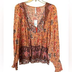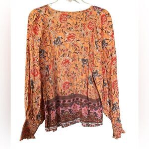Floral Smocked Casual Holiday Beach Babydoll Long Sleeve Blouse L