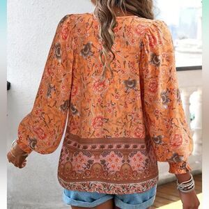 Loose Tops Long Sleeve Tie V Neck Boho Floral Smocked Casual Blouse Holiday Beach Babydoll