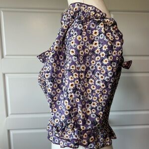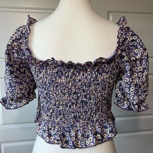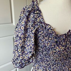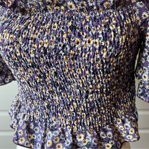 Keywords: floral crop top, smocked blouse, ruffle top, square neck top, purple blouse, puff sleeve top, daisy print, summer top, blouse shirt, womens top, boho top, bohemian top