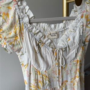 Embrace elegance with this floral smocked maxi dress. Featuring a beautiful blend of white and yellow, this dress is perfect for any occasion. The smocked bodice and flowing skirt offer a flattering fit.