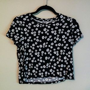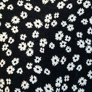 Soft cotton, perfect for summer. Can be paired with shorts, jeans, and even circle skirts. Great for layering under denim jackets and anoraks! The picture looks almost black, but in person it's a navy blue with an artsy white flower print!
