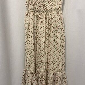 Charming floral dress with spaghetti straps. Features a ruffled hem and a fitted bodice. Perfect for a casual outing.
