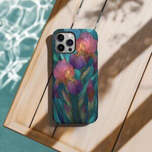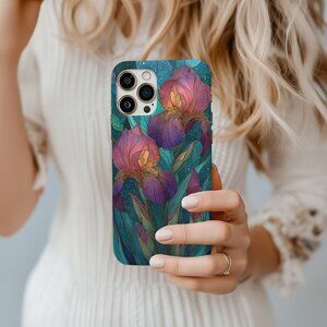 Enhance your phone with this stylish pink blue peach purple green enchanted illuminated iris flowers faux glitter iridescent opalescent pearlescent mystic flower trendy luxury floral faux stained glass design IPhone 16, 15, 14, 13, 12, 11, 8, X, XR, XS, XS Max (Pro Max, Pro, Plus, Mini) case. Perfect for adding a touch of elegance to your device.