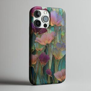 Enhance your phone with this stylish pink peach blue purple green enchanted illuminated pressed flowers faux glitter gem iridescent opalescent pearlescent mystic flower trendy luxury floral faux stained glass crystal rhinestone design IPhone 16, 15, 14, 13, 12, 11, 8, X, XR, XS, XS Max (Pro Max, Pro, Plus, Mini) case. Perfect for adding a touch of elegance to your device.