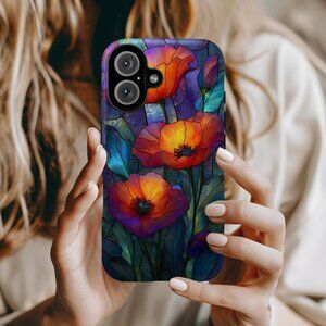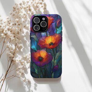 Enhance your phone with this stylish yellow orange red blue purple green enchanted illuminated poppy flowers iridescent opalescent pearlescent mystic flower trendy luxury floral faux stained glass design IPhone 16, 15, 14, 13, 12, 11, 8, X, XR, XS, XS Max (Pro Max, Pro, Plus, Mini) case. Perfect for adding a touch of elegance to your device.