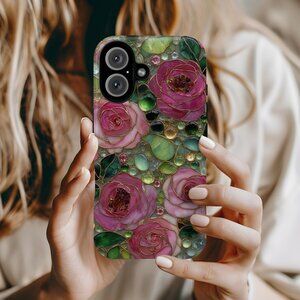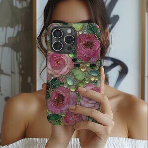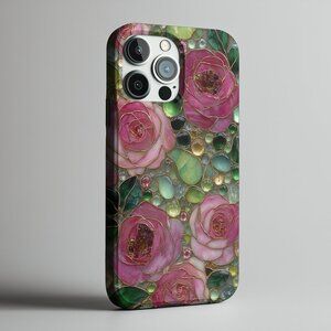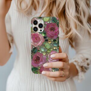 Enhance your phone with this stylish pink green rose flowers faux gems stones luxe glam iridescent opalescent pearlescent beautiful flower trendy luxury floral faux stained glass crystal rhinestone design IPhone 16, 15, 14, 13, 12, 11, 8, X, XR, XS, XS Max (Pro Max, Pro, Plus, Mini) case. Perfect for adding a touch of elegance to your device.