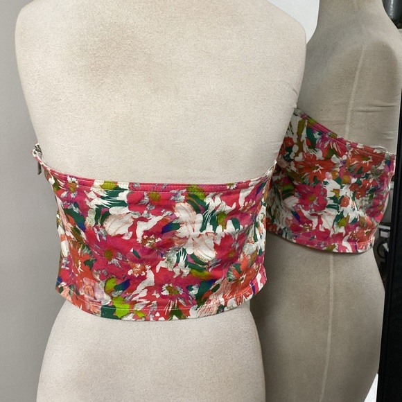 Vibrant floral strapless bustier top. Perfect for a bold look.