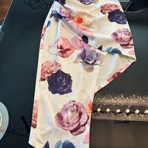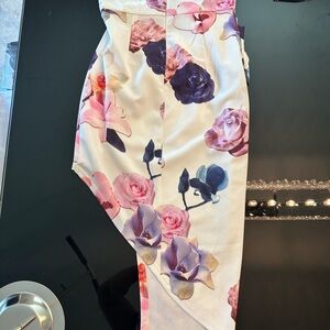 Elegant strapless dress with a vibrant floral pattern. Perfect for special occasions.