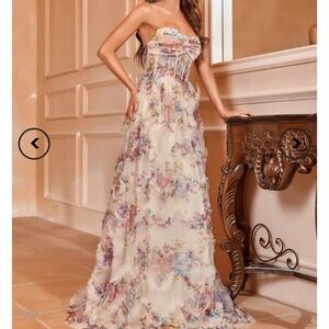 Embrace elegance with this stunning floral strapless maxi/floor length tube dress, with a sheer bodice and light boning. This cream/apricot colored dress features a beautiful floral pattern that adds beauty and joy to your day - and will undoubtedly receive endless compliments from others!