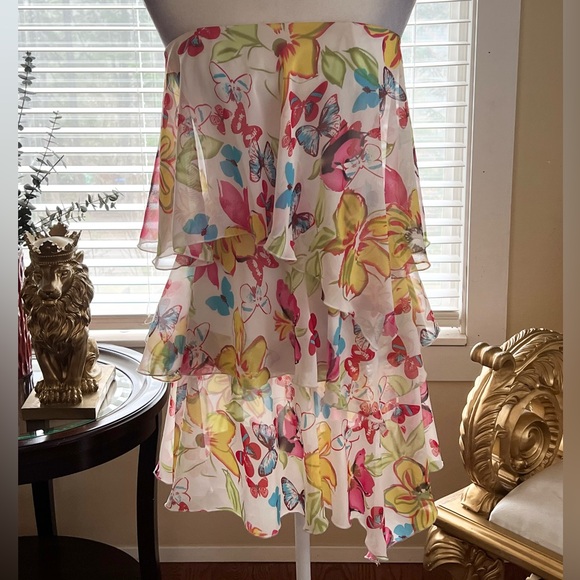 Embrace vibrant style with this strapless ruffle top featuring a colorful floral and butterfly print. Perfect for adding a pop of color to your wardrobe.