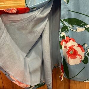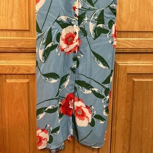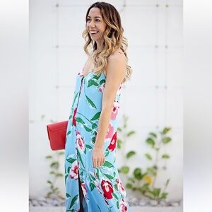 Elegant midi / maxi dress with a floral pattern. Features strappy shoulders and button details. Perfect for a summer outing.