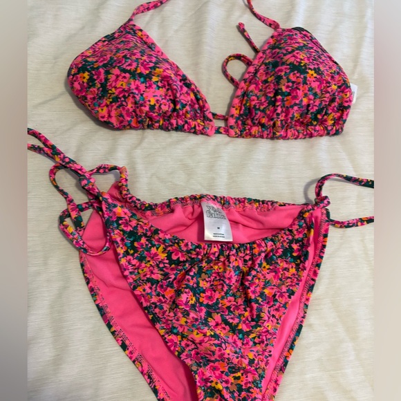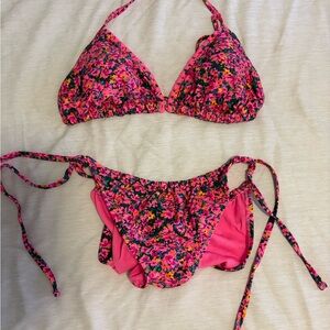 Vibrant floral bikini set with pink, orange, and green hues. Perfect for a stylish beach day.
