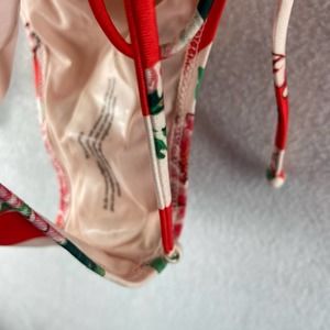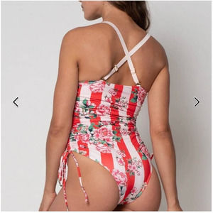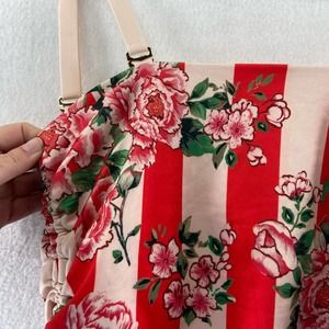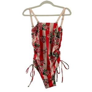 This stylish one-piece swimsuit features a vibrant red and white striped pattern with beautiful floral accents. Perfect for a day at the beach or pool.
