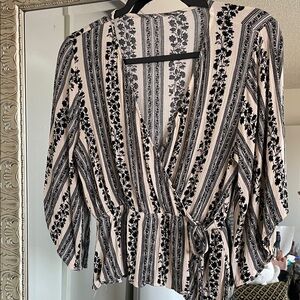 Elegant wrap top featuring a floral and striped design. Perfect for any occasion with its stylish black and cream colors.