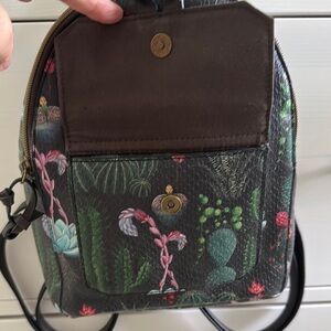 Cute little backpack with succulent pattern, one outside pocket, one inside open pocket.