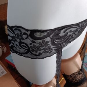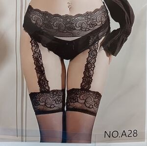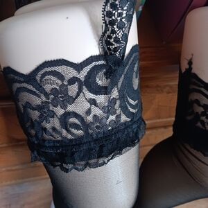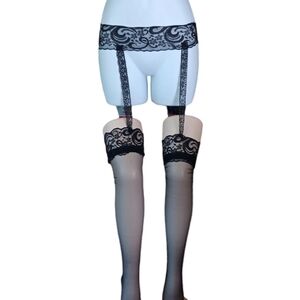 Up for sale is a pair of beautiful and fun black floral lace tights/pantyhose with a suspender garter type attachment. These are nice because you don't have to have the garter clips which can get uncomfortable. These have lace attached to the upper "belt". They're really cute in person. They look a little funny in my picture with the two mannequin pieces- but use your imagination lol. They are delicate lace and fine pantyhose material. Perfect for work, play, and everything in between. One size fits most. Thanks for looking!