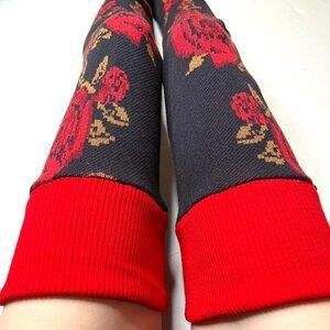Incredibly soft and cozy. Black with red flowers knit long leg warmers with red sweater knit ribbed bands. Thigh high length. Made from recycled/upcycled/reworked materials. If you have larger arms, you may also be able to wear these as super long arm warmers.