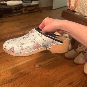Purchased these from an adorable vintage shop in Scotland. They are a hair too small for me (I’m a 7.5 in shoes typically). Some light creasing on one of the toes. Unique charming pair of Swedish clogs!