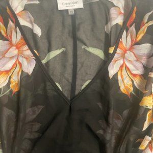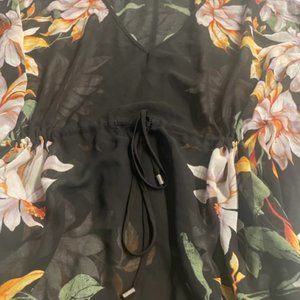 This beautiful floral and sheer cover up features drawstrings to adjust to your body and liking.