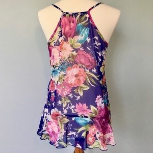 Adorable ruffled tank top for summer. Thin straps with racer back. In flawless condition! Colors include blue, pink, green, coral, white, purple in a beautiful bold and preppy floral pattern. Women’s size small.