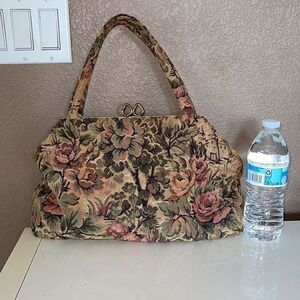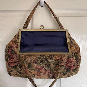 Elegant floral tapestry handbag with a vintage charm. Perfect for adding a touch of sophistication to any outfit. Used for Mary Poppins costume and looked perfect, but is in good enough condition for everyday use!