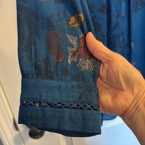 Elegant teal dress with floral patterns. Perfect for any occasion.