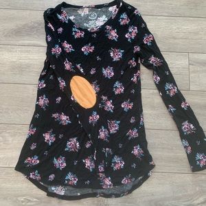 Long sleeve 24/7 tee by maurices. Black with blue and purple flowers. Suede patch on elbow. Minimally worn. Smoke free, pet free home.